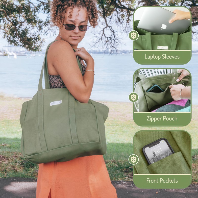 Harp + Ra Extra Large Canvas Tote Bag – Cotton Shoulder Bag, Laptop Compartment, 2 Pockets, Unstructured Design, No Zipper