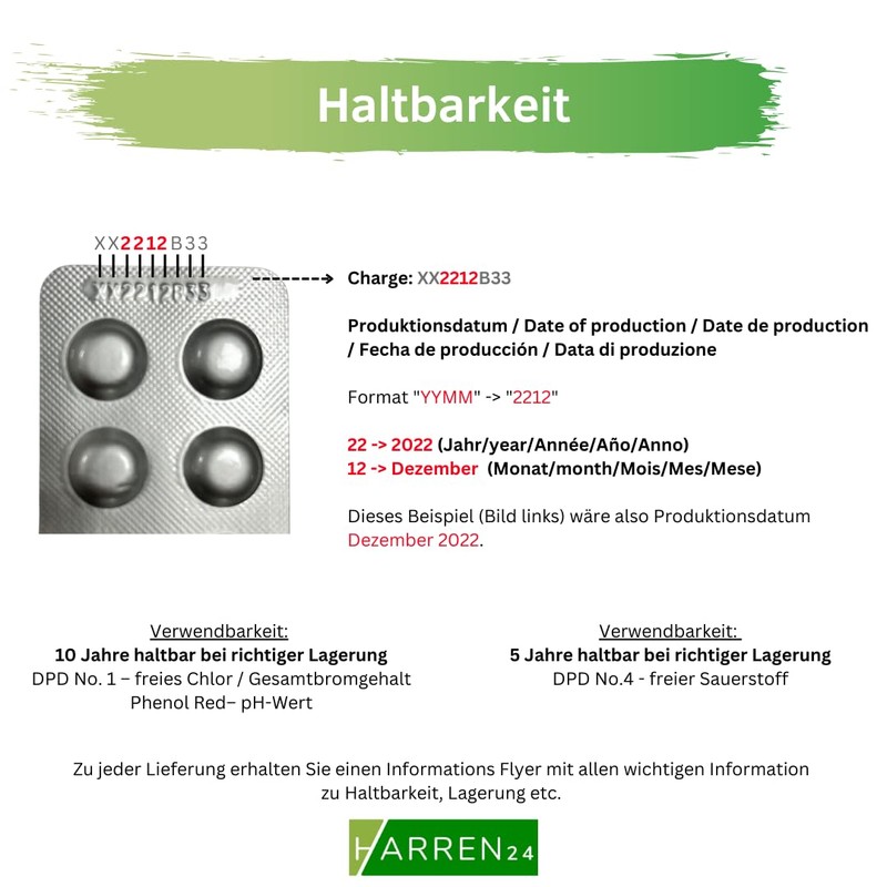 - Don't leave your water quality in the pool, pond, jacuzzi or whirlpool to chance. Test regularly with harren24 pool tablets from always fresh production "Made in Germany" with very long durability.