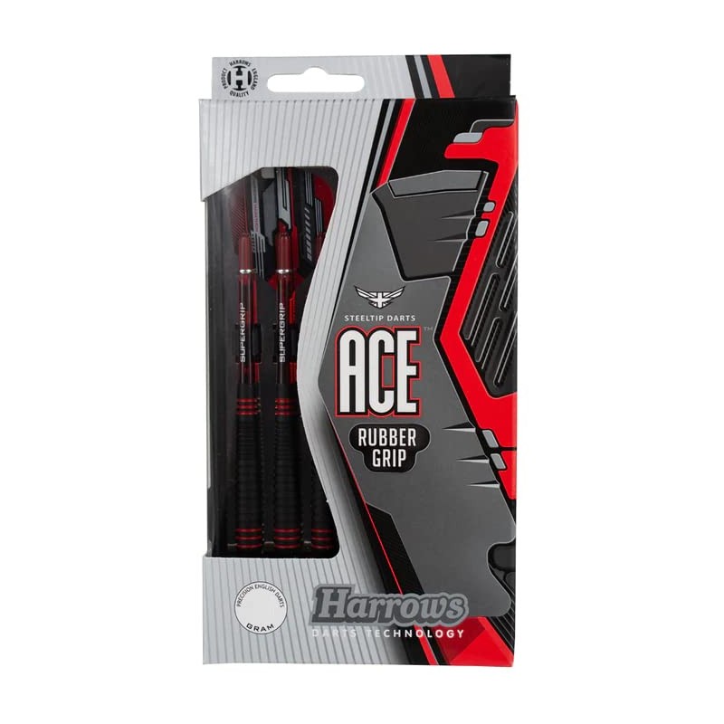 - Harrows Ace Rubber Grip Darts – Experience the ultimate, non-slip performance with Harrows Ace Darts. The barrels feature a unique, vulcanised rubber grip for improved control and superior grip. Supergrip stems and 100 micron Marathon flights complete the total grip concept and provide aerodynamic perfection.