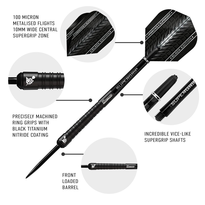 - Unique Black Titanium Nitride Coating for Grip and Control - The dart features advanced grip technology from Harrows R&D, including testing by our professional players. It is coated with black titanium nitride and precision post-machined to provide the unique and effective deep single and double rings the length of the barrel, resulting in the world famous "Supergrip" handle. Exceptional control and stability for maximum precision on the dartboard.