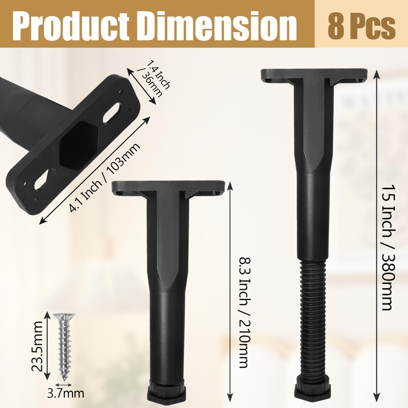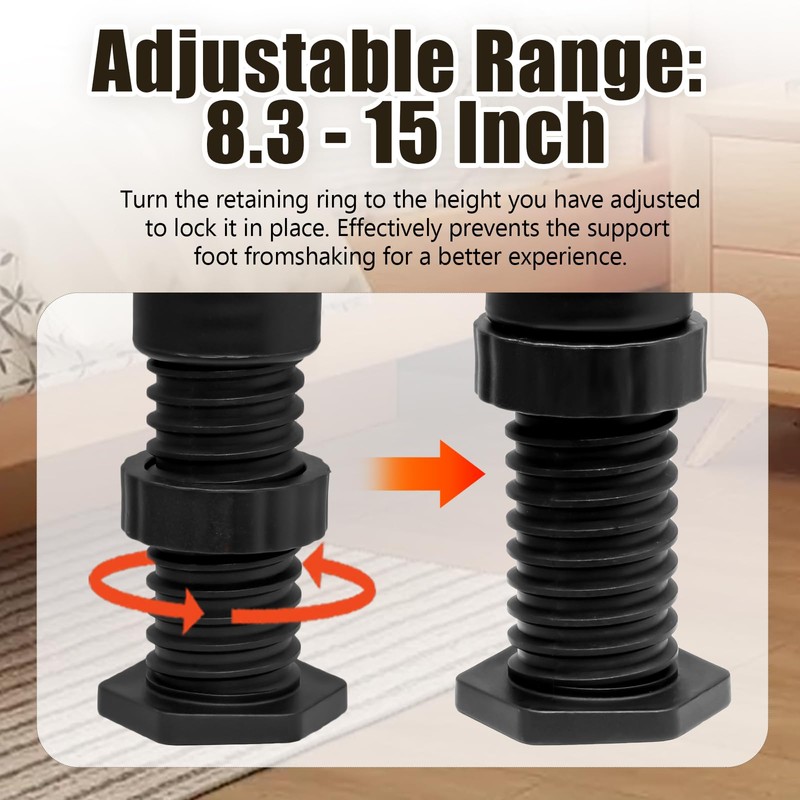 - Height adjustable: The height of these bed support legs can be modified using the swivel base. The minimum height is 8.3 inch, while the maximum extends to 15 inch. Please verify the required length before purchase to ensure it meets your needs