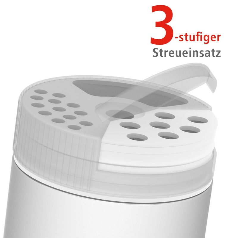 - 3-stage shaker insert (fine, coarse, open) with resealable hinged lid