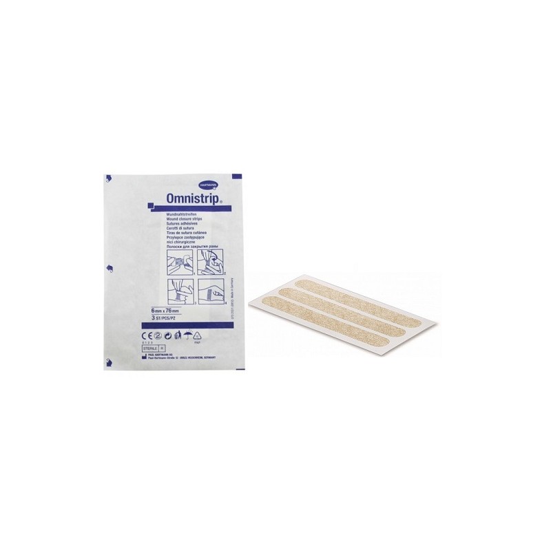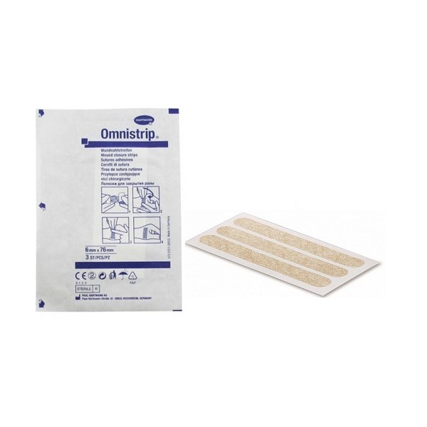 Omnistrips are hypoallergenic wound closure strips made of skin-coloured non-woven fabric with polyacrylate adhesive, with rounded edges that prevent lifting. They are extremely permeable to air and water vapour, no maceration, adhere reliably, can be removed without pain and without leaving residues, radiolucent, temperature resistant and durable. Omnistrips differ from most skin closure strips as they are beige in colour so as to be more discreet. They also have rounded ends to each strip, minimising the chance of them being caught and then lifting from a corner.