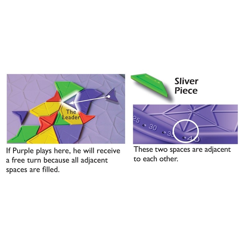 Scoring occurs when certain parts of the board are captured by a player's pieces. Scattered across the board are ten circle areas and six star areas. Any time one of these shapes is completely filled in by pieces, points are awarded. The first player to reach 40 points wins. As the board becomes increasingly crowded, the game becomes a mad-dash for these special point- awarding "territories." Games are brisk and fast-paced, and typically take a little more than 15 minutes to resolve.