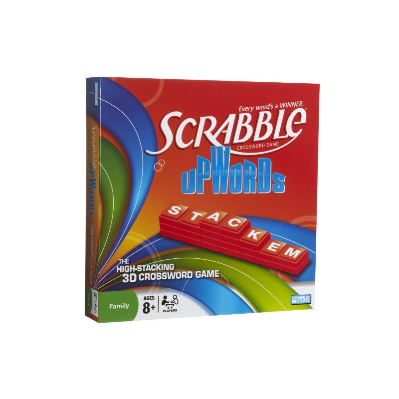 It's a high-stacking 3D crossword game! You and your opponents spell words with stackable letter tiles on the special gameboard to score points. Build words by playing letters across or down on the board and by stacking letters on top of letters already on the board to form new words. It's this 3-dimensional game play that makes Scrabble Upwards so unique and challenging to play. Score points for each letter in your word and every letter tile under each letter of your word. Letters can be stacked five tiles high--so your score can really add up fast! Build words stack letters, score high and have fun!