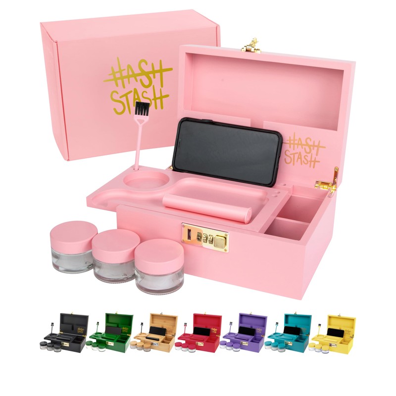 HASHSTASH The OG Storage Box - Large Bamboo Box with Combination Lock, Magnetic Lid, Organizer Tray, Tube, Brush and 3 Jars - Discreet Decorative Stash Storage Lock Box with Accessories (Pink/Gold)