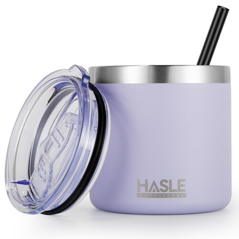 HASLE OUTFITTERS - Vasos aislados de 10 onzas con tapa y popote, vaso de acero inoxidable, taza de café de viaje, reutilizable de doble pared para bebidas heladas y calientes (morado, 1 unidad)