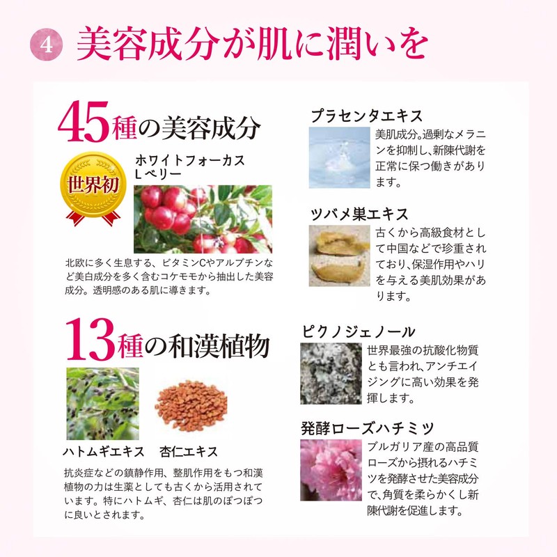 Contains 45 moisturizing and beauty ingredients (85% of beauty ingredients) including "ringon berry" which leads to a transparent skin and "hyaluronic acid" and "placenta extract" that are often lost after cleansing.