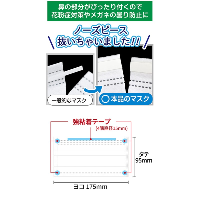 - 【特 徴】ノーズピースなし!テープで密着するやわらかマスクです。ひもなしで耳のストレスゼロ!3層構造で平均値99%以上を実証。