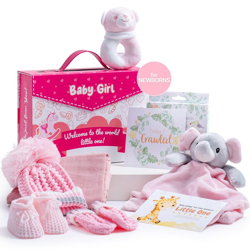 - Thoughtful and Practical Gift - Includes new born baby essentials such as pink elephant comforter, bear rattle toy, 100% cotton muslin cloth 70x70cm, ribbed hat & mitten set, baby booties, baby milestone cards. Each item has been selected with both the baby’s and parents’ needs in mind