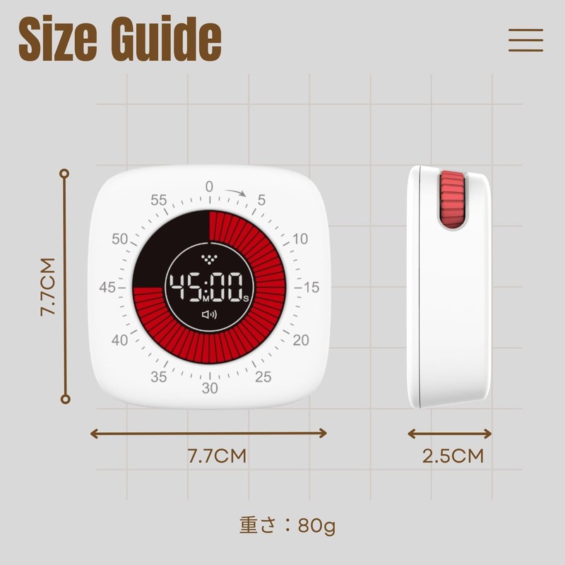 - Visual timer that allows you to see the passage of time at a glance: The remaining time and elapsed time are displayed on a red bar with high visibility, making it the perfect timer for studying and learning