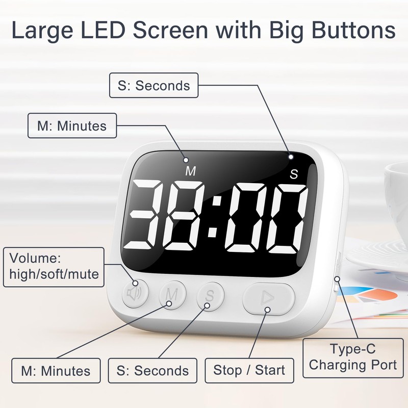 - Built-in Rechargeable Battery and Energy-saving Mode: Say goodbye to constantly replacing batteries. This waterproof timer comes with a built-in rechargeable lithium-ion battery and USB-C charging cable. Simply charge it up before first use and enjoy long-lasting power. Energy-saving mode: If the timer is not in use, the LED screen automatically turns off after 10 seconds of inactivity; If the timer is in use, the LED screen switches to low-level brightnes 10 seconds after starting the timing.