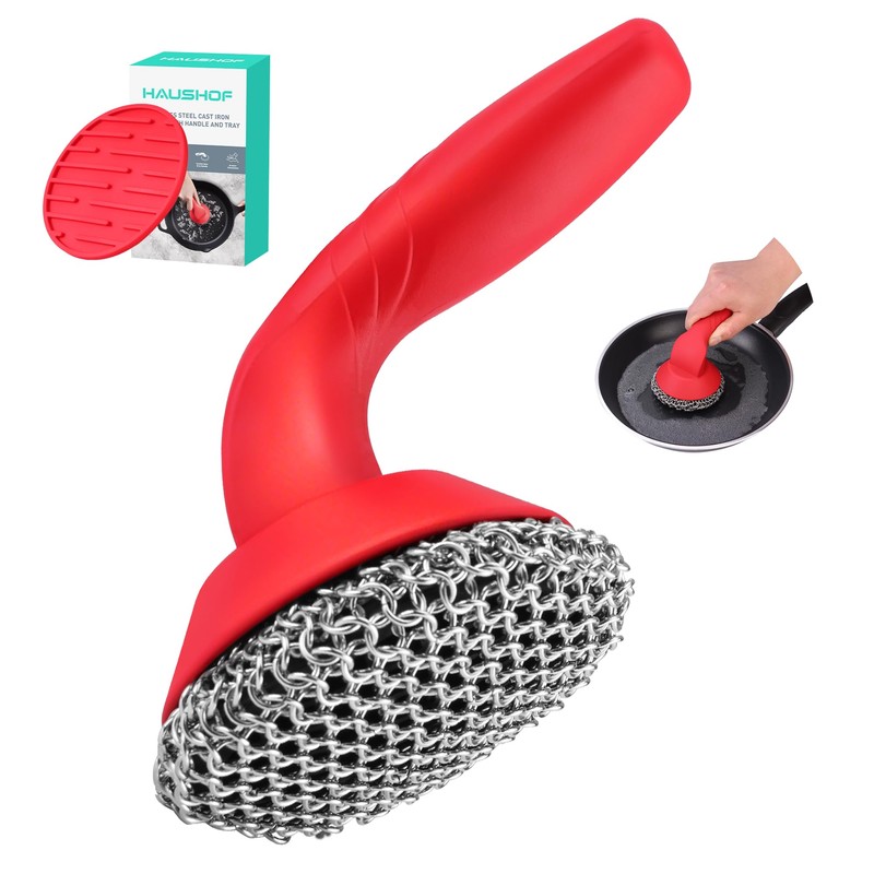 - Cast Iron Cleaner Set: HAUSHOF cast iron scrubber is made of premium stainless steel rings and features an ergonomic, anti-slip handle for a comfortable grip; The included silicone tray makes drying and storage easy