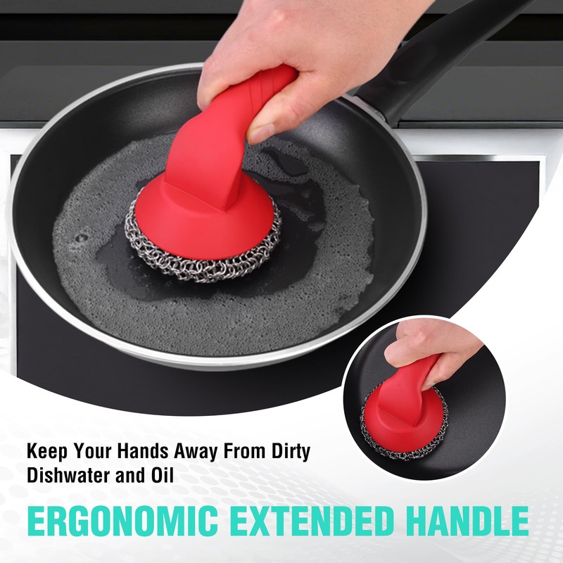 HAUSHOF Cast Iron Scrubber with Long Handle, Chainmail Scrubber Cast Iron Cleaner for Pan, Kitchen Cleaning Kit for Grill, Dutch, Oven