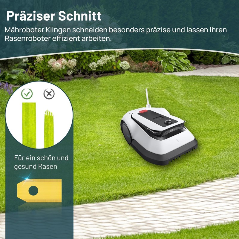 - 60% longer service life and sharpness: save time, money and effort. Thanks to the high-quality titanium coating on robust 0.75 mm stainless steel, our knives stay razor sharp for up to 60% longer than conventional blades. The double-sided grinding edges allow for double use - simply turn and use the full sharpness again. Less blade changes, more perfect mowing results throughout the season.