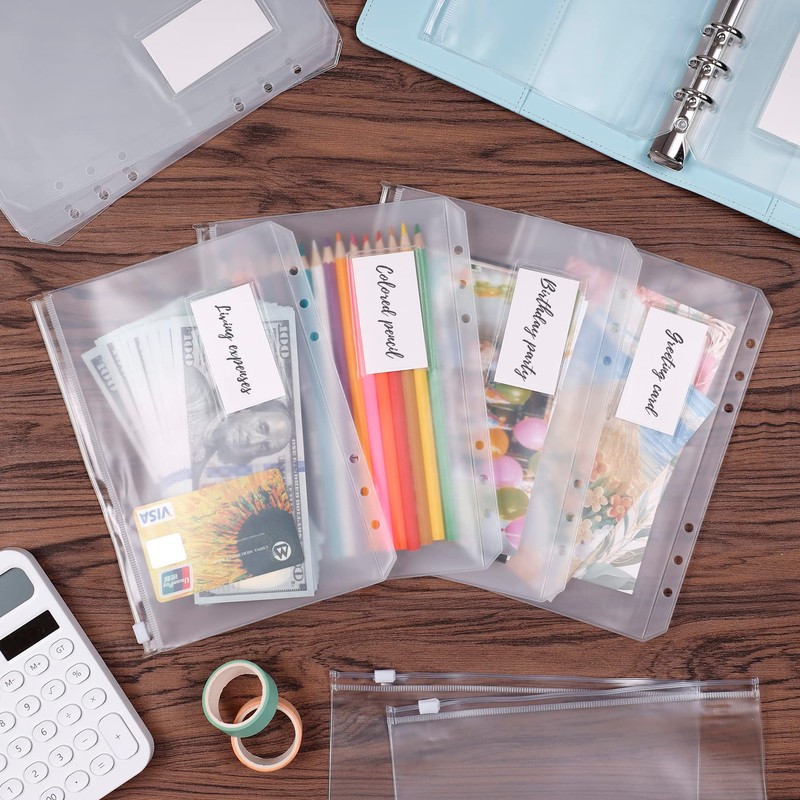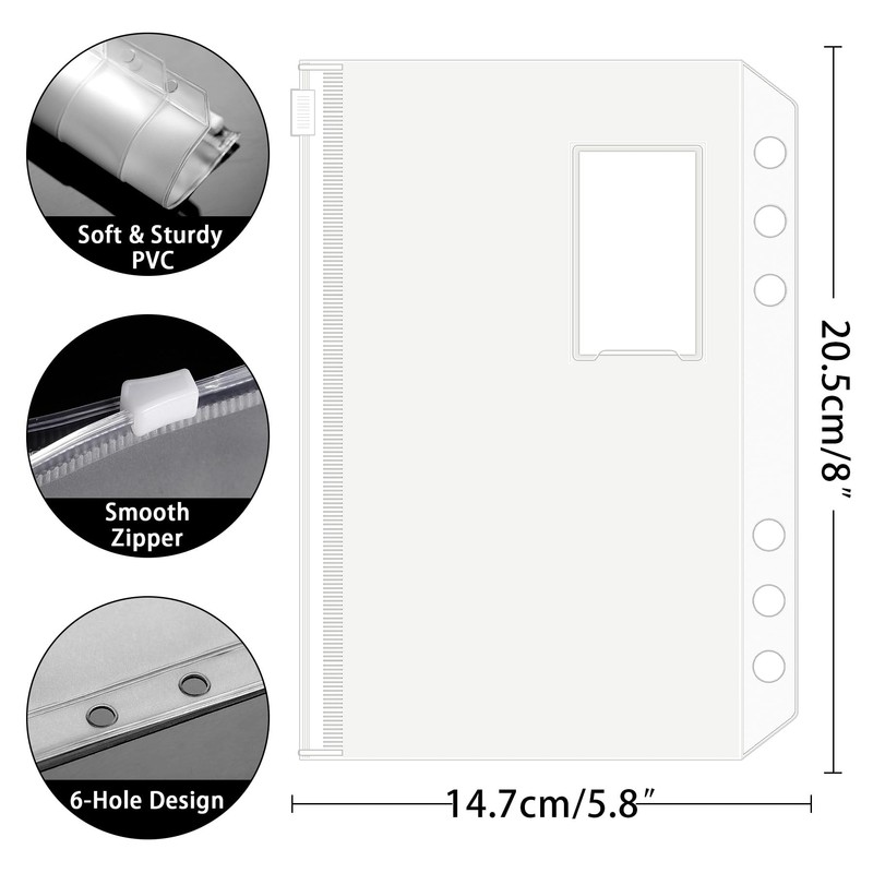 HAUTOCO Pack of 12 A5 Folder Pockets, 6-Hole with Label Pocket for A5 Notebook Binder Planner, Plastic Zip Pocket, Cash Budget Envelopes, Waterproof Loose Leaf Pockets