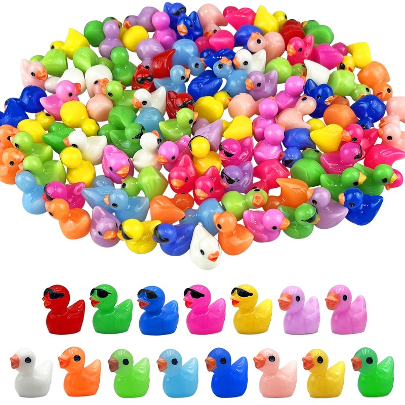 You will receive 100 miniature ducks, 5 colors with glasses, 4 of each color, and 10 colors without glasses, 8 of each color, which you can use to decorate a dollhouse, garden or as a DIY craft accessory.