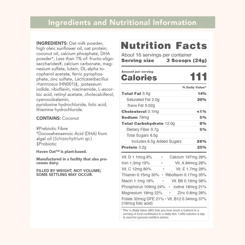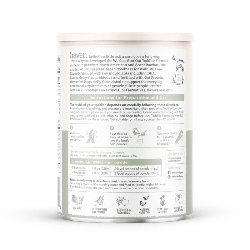 Haven Oat Toddler Formula, Plant Based Dairy Free Oat and Oat Protein Powder for Toddlers With Probiotics, Prebiotics, Lutein and Omega 3 Dha, Easy Digestion Formula, Non GMO, American Made, 14.1 Oz