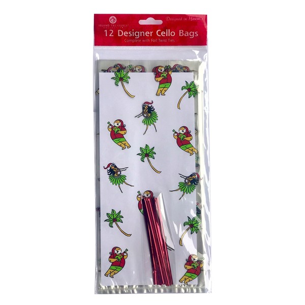 These bags feature Hawaiian themed designs. Pack of 12 cello bags and ties. Measures 4 13/16" x 9 1/2" x 2 5/8"