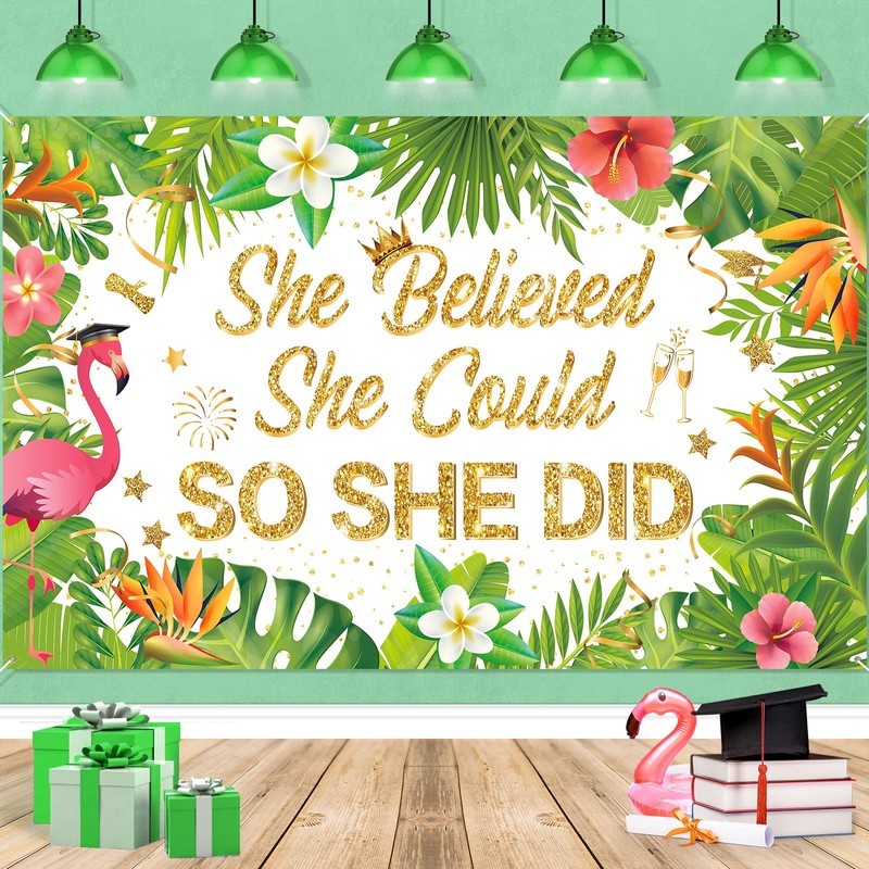 • 🎓[Special Design]- She Believed She Could So She Did banner is designed with Hawaii-themed and summer tropical elements such as tropical leaves, flowers, and flamingos, and eye-catching ''She Believed She Could So She Did'' words. It would be an impressive decoration for the women girls' Class of 2024 High School/College graduation party