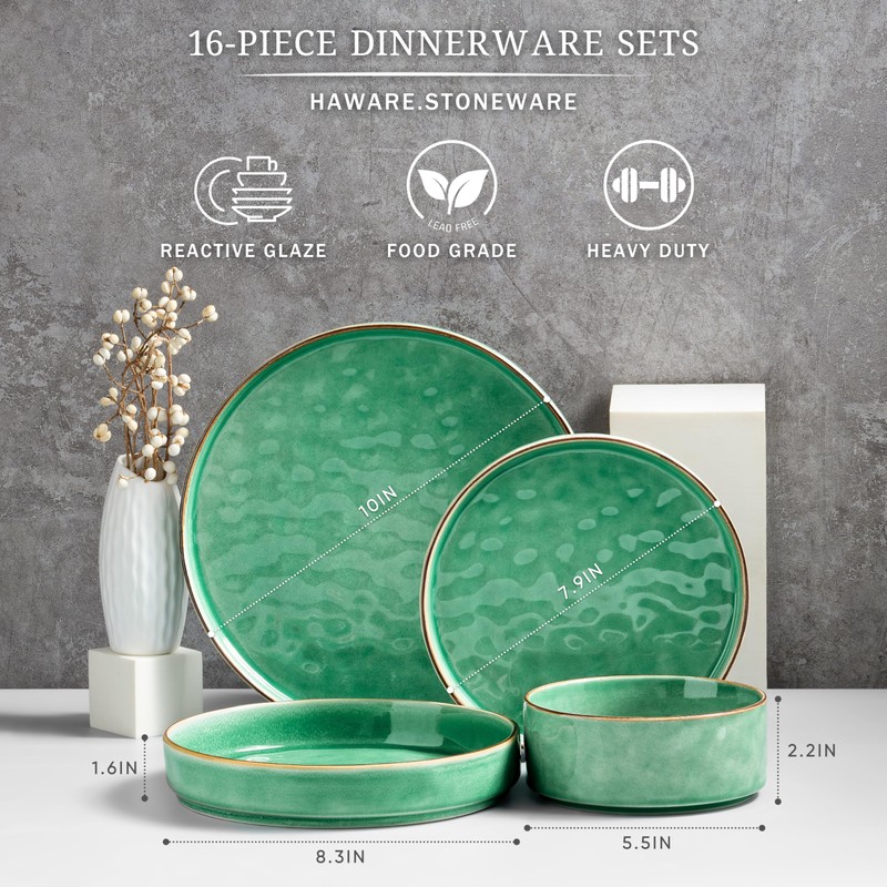 HaWare Dinnerware Sets, 16-Piece Plates and Bowls Set, Stoneware Dish Set for 4, Ceramic Dishware Set for Pasta Cereal, Chip and Scratch Resistant, Microwave and Dishwasher Safe, Reactive Green