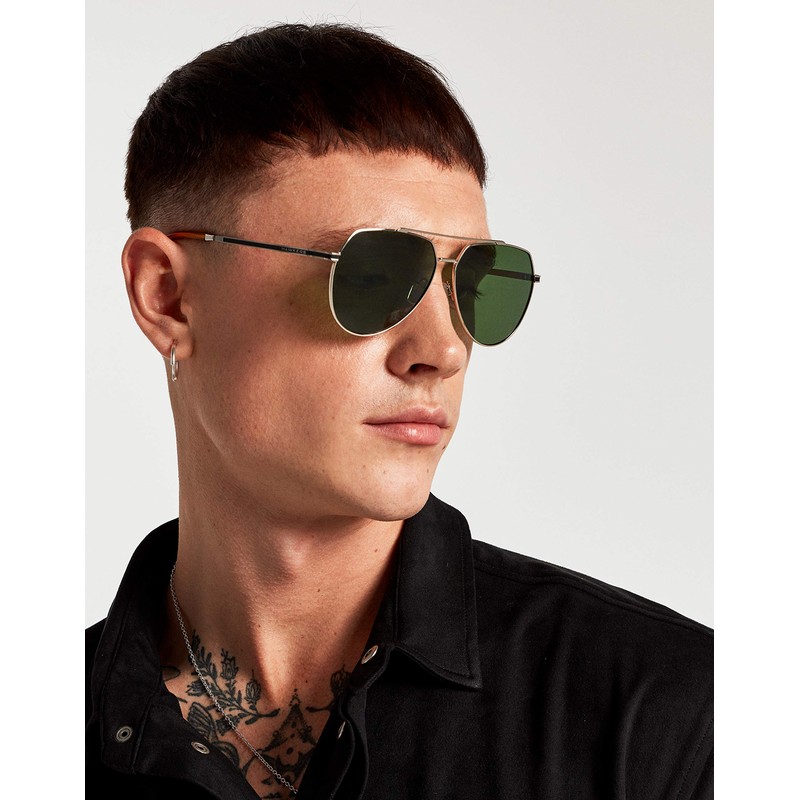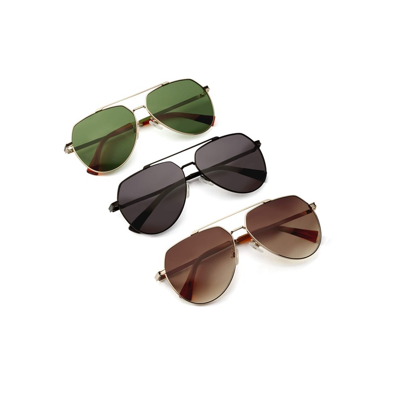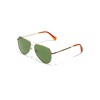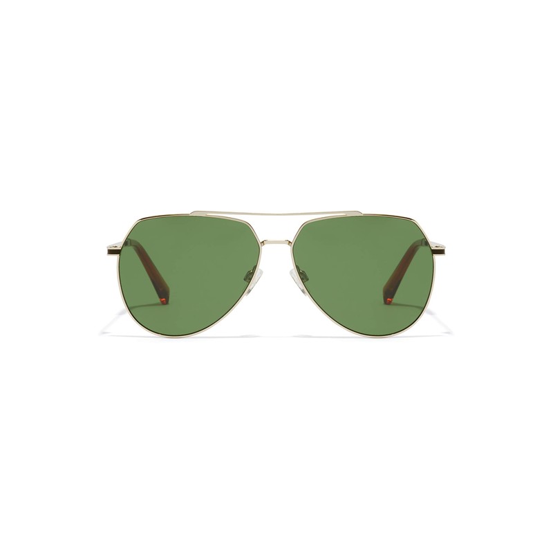 - A redesign of the classic pilot sunglasses from the Second World War. It combines bottle green oversized polarized lenses, a light gold metal frame, black slit temples and transparent caramel ends. A versatile design that will never go out of style.