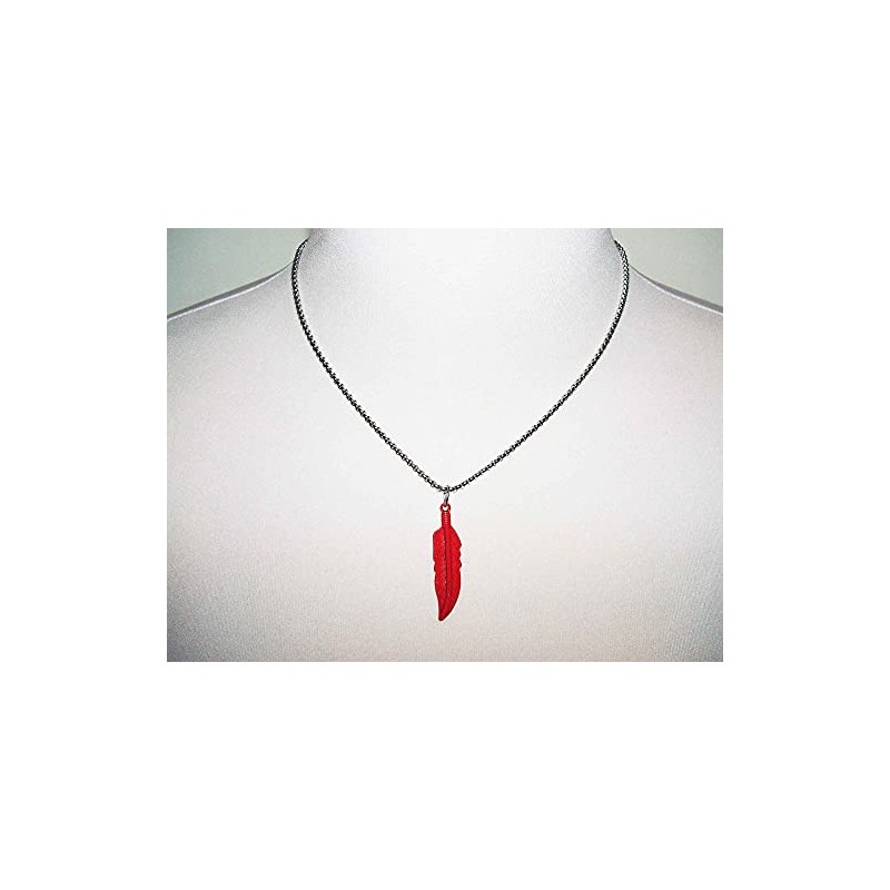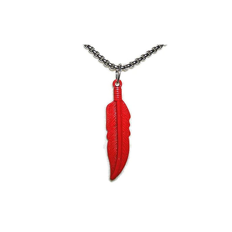 - The necklace features a 1 5/8" RED metal feather pendant.