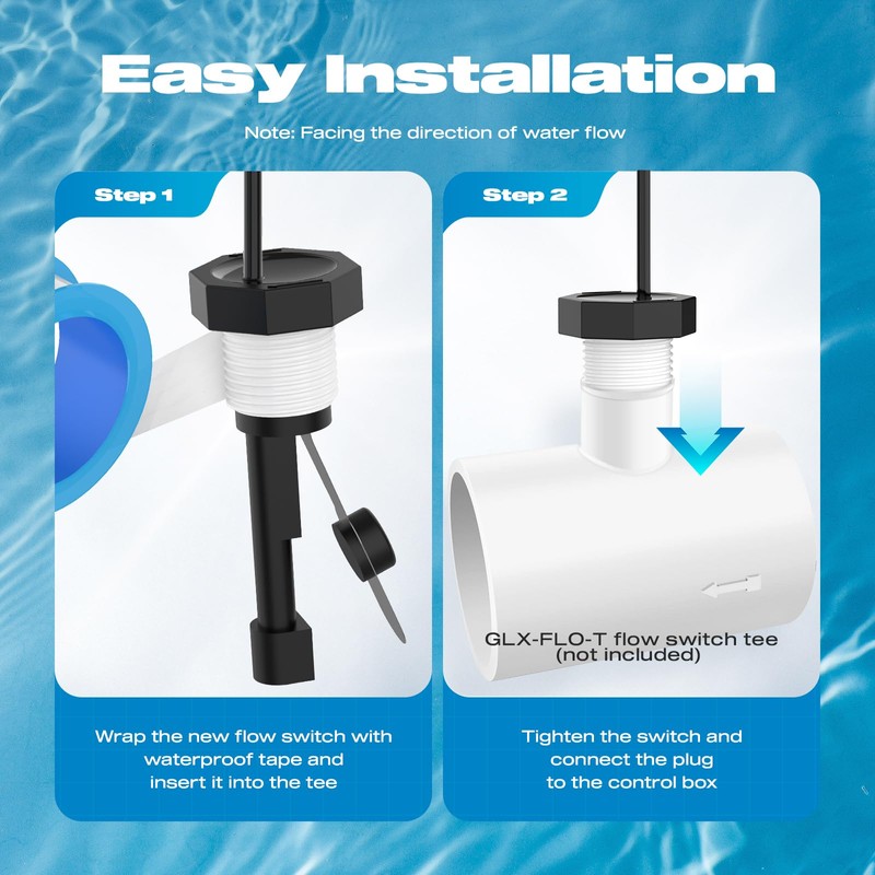- Easy Installation: The GLX-FLO-RP flow switch utilizes standard 1/2'' threads, simply screw the pool flow switch into the tee tube with enough tape and insert a standard phone plug into the control box to complete the installation , this quick and easy process will turn off the "no flow" warning light in minutes