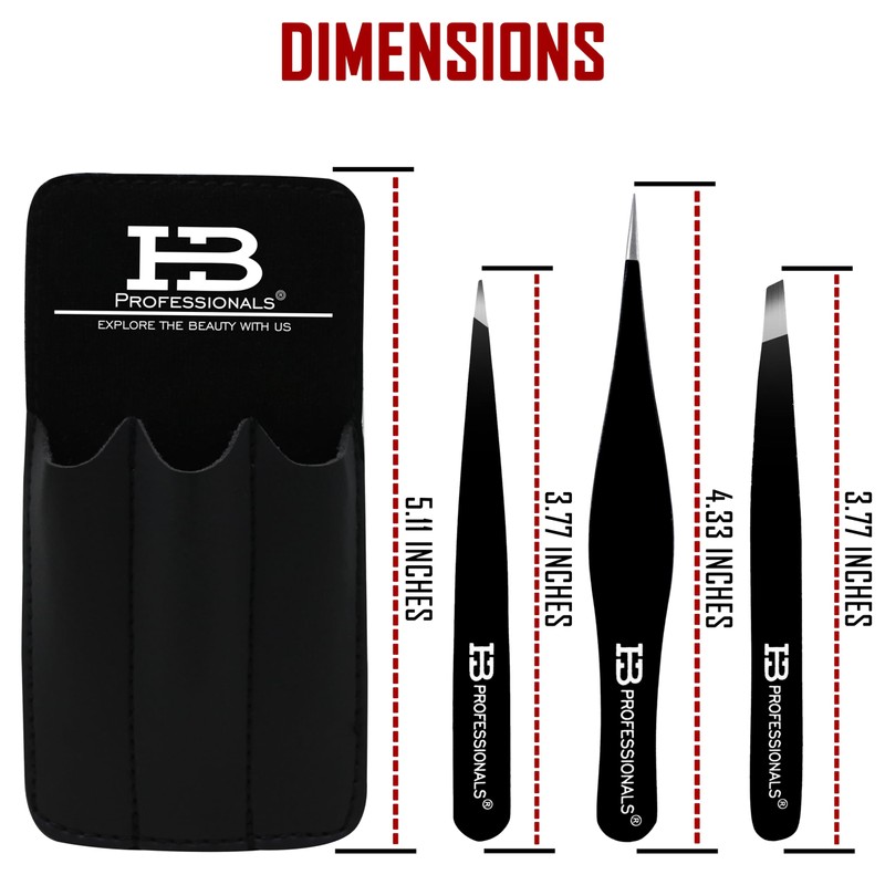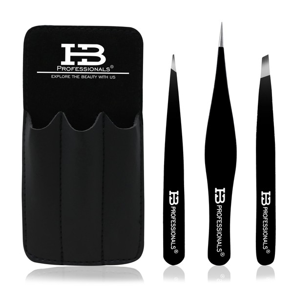 - HB PROFESSIONALS TWEEZERS SET WITH CASE: 3 PCS Set - Black – Set includes a pair of POINTED, SLANT & ULTRA FINE POINTED Tweezers. Bring Out The best In Your Eyebrows!