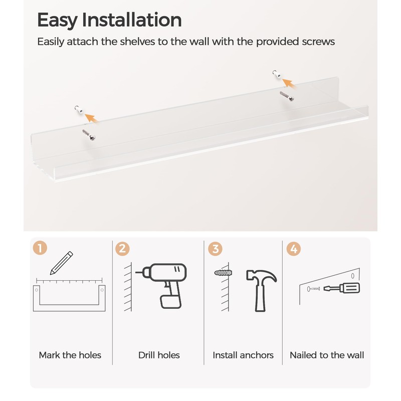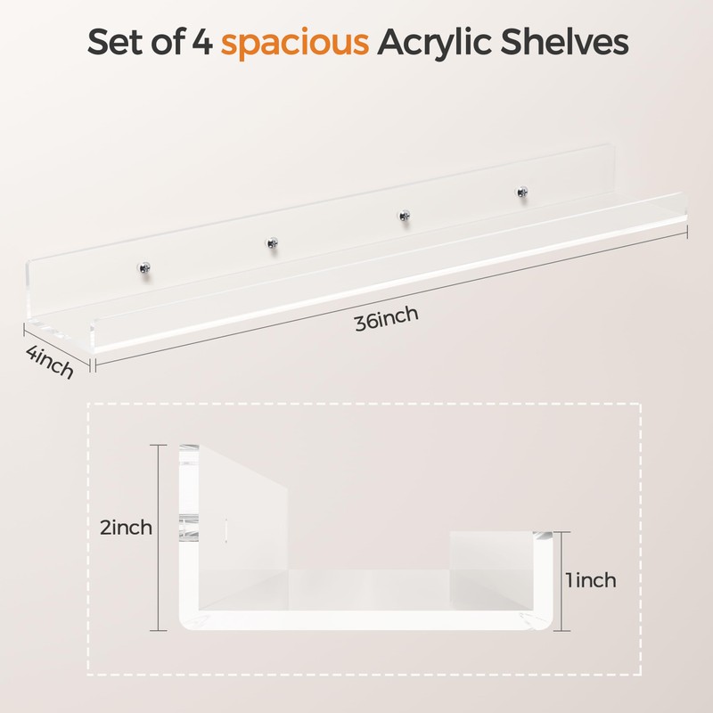 - Dimension and Weight Capacity: 36 Inches floating shelf is perfect for books, it can hold up to 10 pounds. Designed as a clear acrylic shelf, it is easy to see the covers of books, making it easy to look for the books you need.