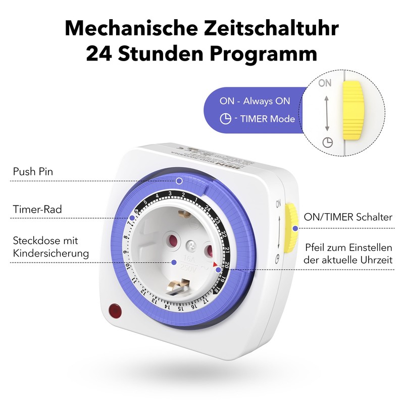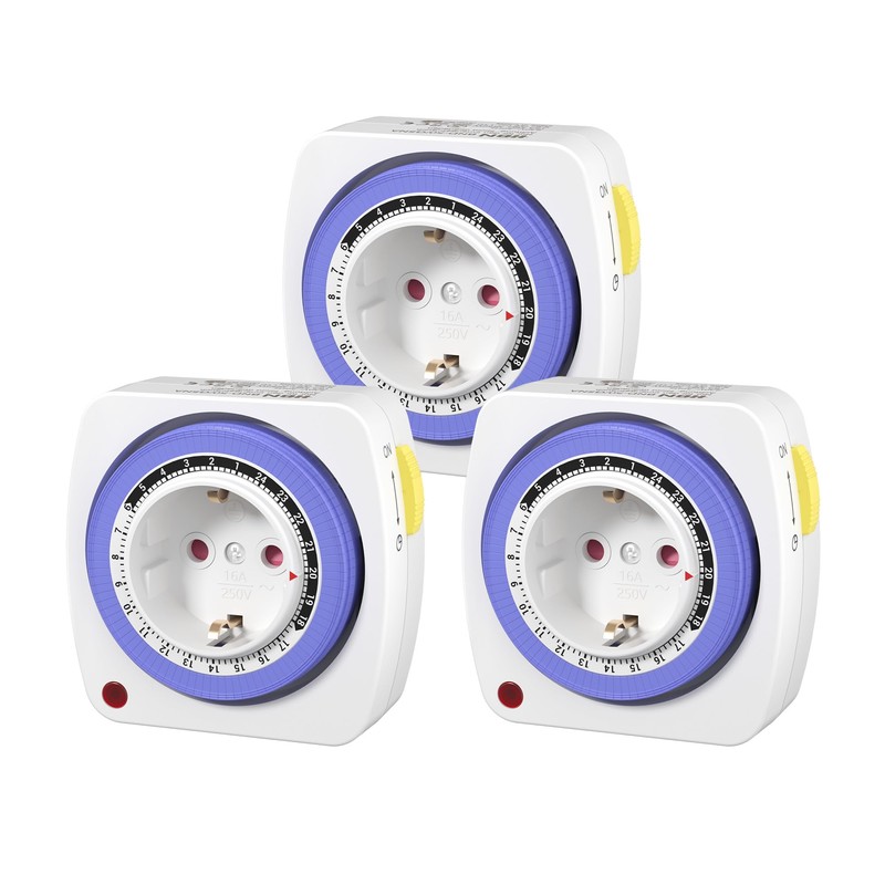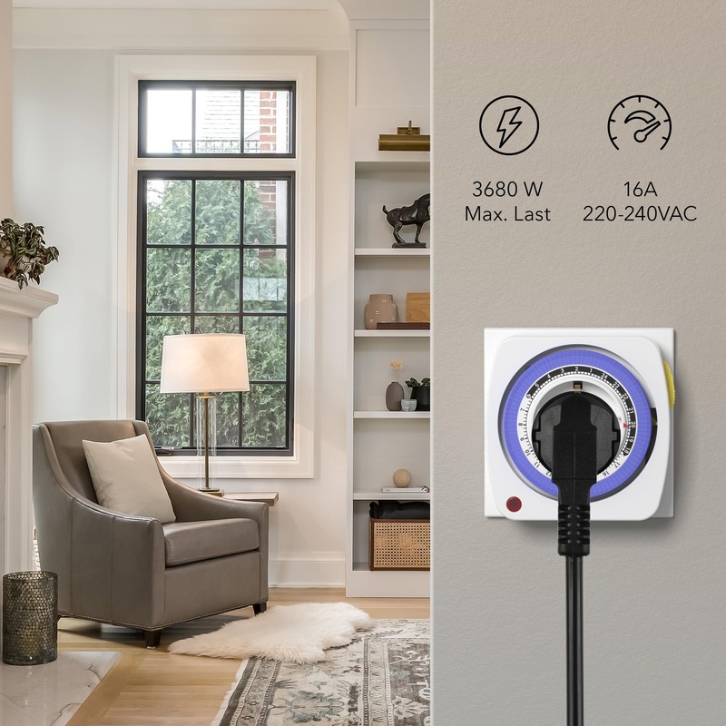 - AUTOMATE ON AND OFF: After the 24-hour schedule, the devices automatically turn on and off. With a simple mechanical adjustment, you have everything under control. In 15 minute increments, you can turn the socket on and off up to 48 times a day.
