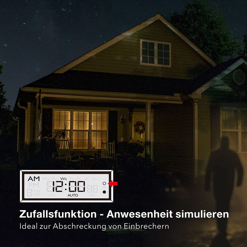 - Random function: the random switching allows a switch-on delay of 2 to 30 minutes. Consumers are randomly switched "On" and "Off". When a lamp turns on or the shutters drop down, you can fake a presence on holiday and make it harder to burglars.