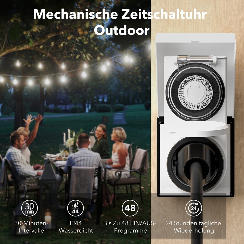 - AUTOMATIC ON AND OFF: After your 24-hour scheduling, the devices automatically turn on and off. Have everything under your control with simple mechanics. With 30-minute increments, you can set the socket yourself max. 24 times per day on or off times.