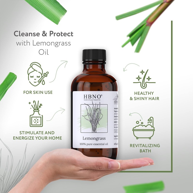 HBNO Lemongrass Essential Oil - Huge 4 oz (120ml) Value Size - Natural Lemongrass Oil, Steam Distilled - Perfect for Cleaning, Aromatherapy, DIY, Soap & Diffuser - Lemongrass Essential Oils