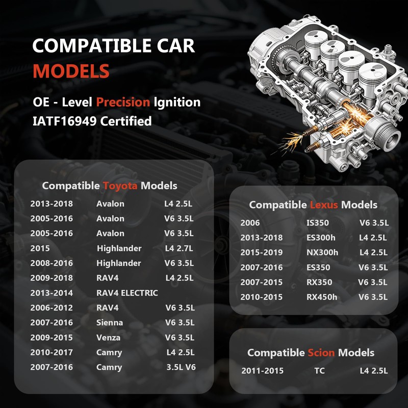 • Applications Vehicle -1: Coil Packs Spark Plugs Compatibility 2007-2015 Toyota Sienna 3.5L V6 | 2005-2016 Toyota Avalon 3.5L V6 | 2007-2015 Toyota Camry 3.5L V6 | 2006-2012 Toyota RAV4 3.5L V6 | 2009-2015 Toyota Venza 3.5L V6 | 2008-2015 Toyota Highlander 3.5L V6