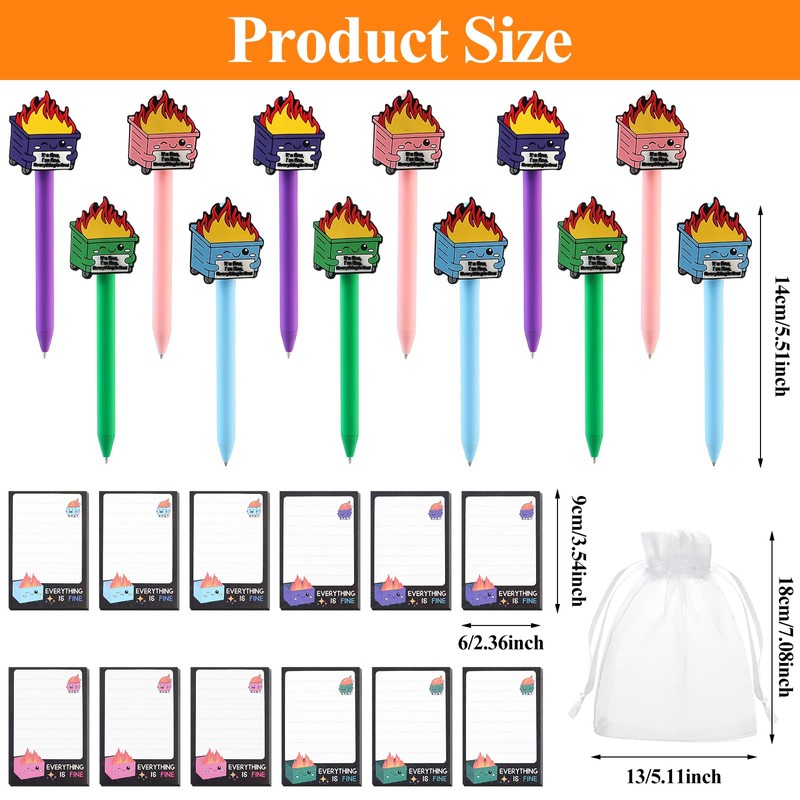 - 【Rich Dumpster Fire Office Gifts】This comprehensive dumpster fire desk accessories includes 12 sticky notes in 3 styles, each with 50 sheets featuring "Everything is fine" burning dumpster design, and 12 dumpster fire retractable ballpoint pens, 12 white organza bags. Sufficient quantity meets all your daily use or gift-giving needs, and funny design brings you joy and laughter.