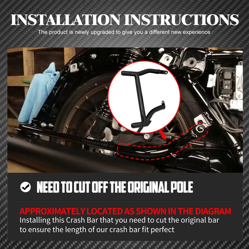 - Easy Installation: Each set of saddlebag guards includes two crash bars, one for each side of your motorcycle, ensuring balanced protection. With only two mounting holes per bar, simply align the bars with the pre-drilled holes on your bike, secure them with screws.(Install Note:Adding a 0.59" (not included) spacer to the lower of the bag guard can effectively increase the distance between the bag guard and the swing arm.Recommend connecting both pieces to each other and starting with the middle bolt to the frame during installation; Don't tighten the bolts until the bracket is in place.)