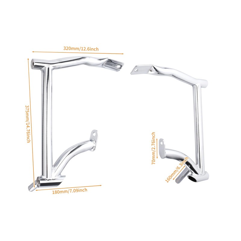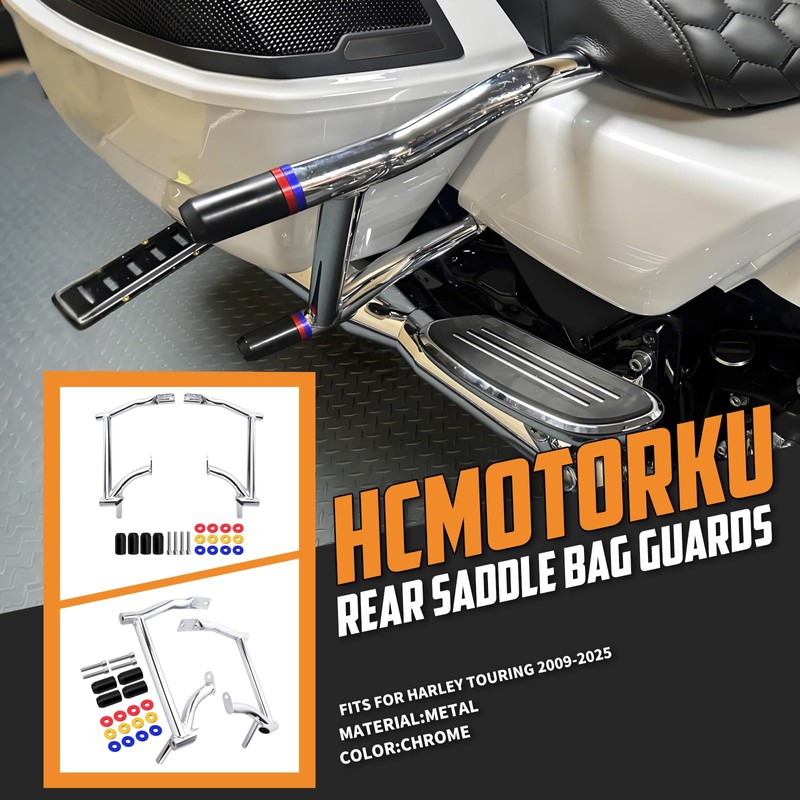 - Material: This saddlebag tip-over crash bar is crafted from premium alloy steel, ensuring exceptional durability and strength. The precise mounting holes are designed to perfectly fit specific Touring models, The thick-walled chrome-plated tubing and the elegant cast mounts clamp securely to the Original Equipment saddlebag guards for a seamless look