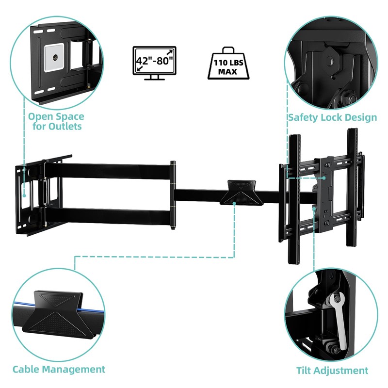 - FOR BETTER SAFETY: Adopted heavy gauge steel construction and thicker mounting arms to boasts a 110lb load capacity, this TV mount ensures you safe operation for smooth extension and pivoting motion. Once the bracket is properly anchored into the wall, you'll never have to worry about your TV getting knocked over or falling due to earthquake or horseplay. For any question, reach us anytime!