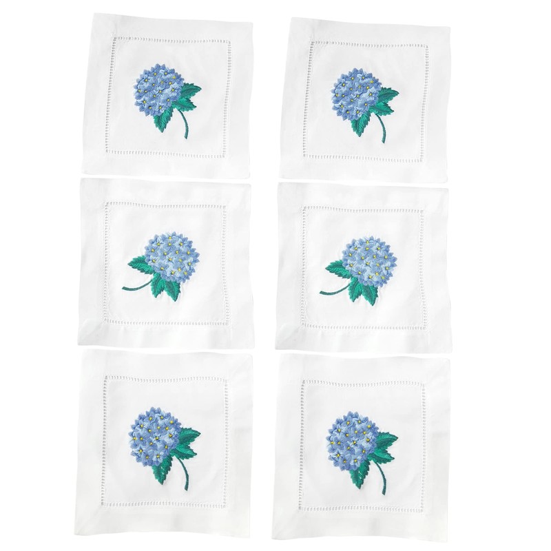 HCRAFT Embroidered White Cocktail Napkins 6"x6" Set of 6 Cloth Napkin Coasters, Hydrangea Embroidered Cocktail Napkins for Christmas Cocktail Napkins Parties, Ladder Hemstitch, Great Present Ideas
