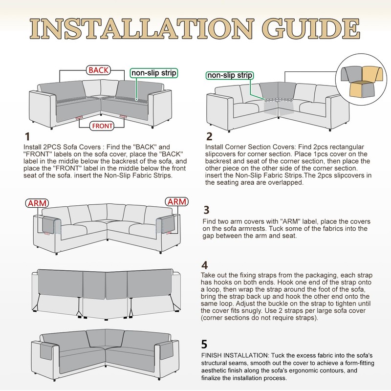- EASY CARE & INSTALL: The sectional couch covers l shape sofa cover is machine washable in cold water. Avoid using bleach or iron. No fading or pilling after washing. The u shaped sectional couch covers is easy to install and remove. Each package comes with installation instructions, which can be independently installed in just a few minutes