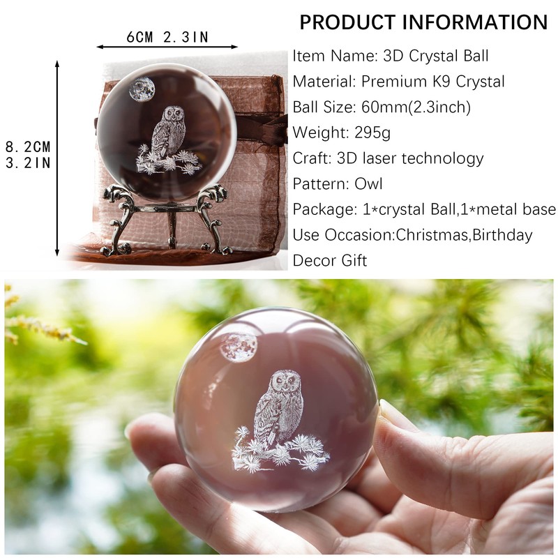 - Diameter - 2.4 inch (60mm). It is equipped with a sliver-plated flowering stand. This lifelike owl is carved in our crystal ball by advanced 3D Inner carving and flame extraction technology.
