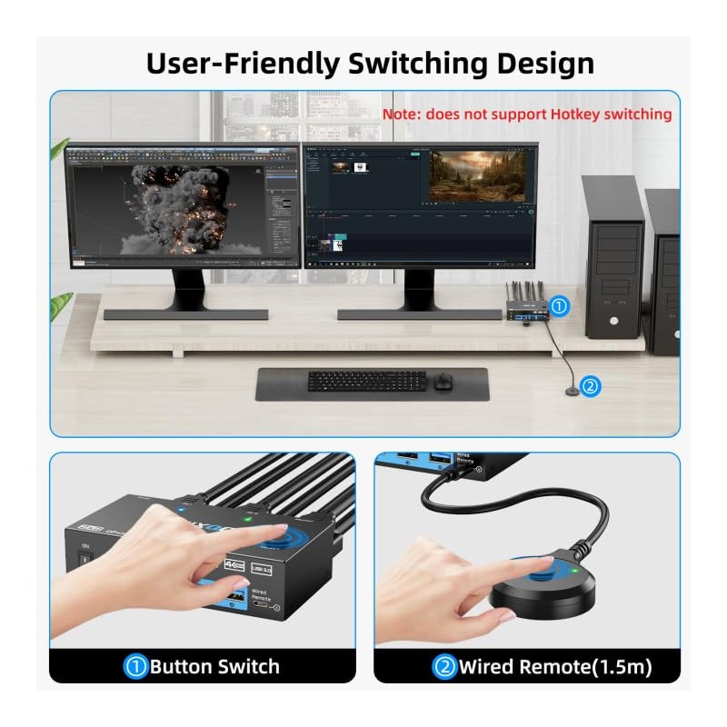 - 【2 Ways of Flexible and Effortless Switching】Supports switching using physical buttons on the kvm switch hdmi and wired remote control, so you can choose what you prefer or a closer approach. Easy to operate, seamless switching in short time. Note: this kvm switch 2 computers 2 monitors does not support keyboard hot key control. From a convenience standpoint, it is an excellent KVM!