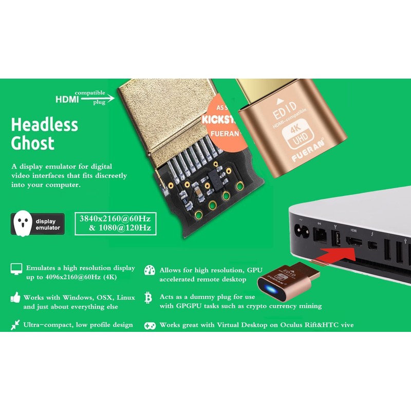 HDMI Dummy Plug Headless Ghost Display Emulator Premium Aluminium PC (Fit Hea...