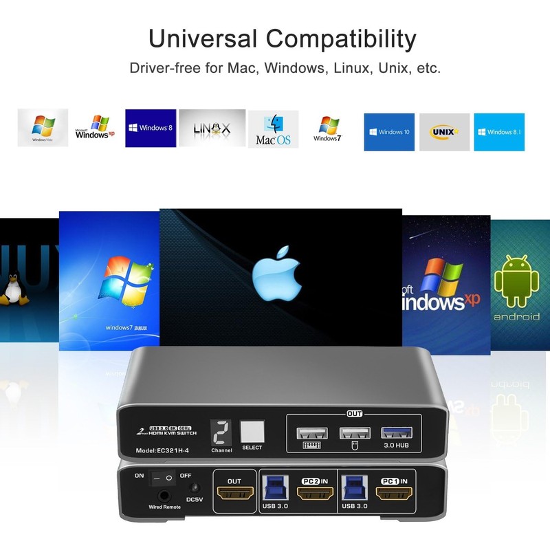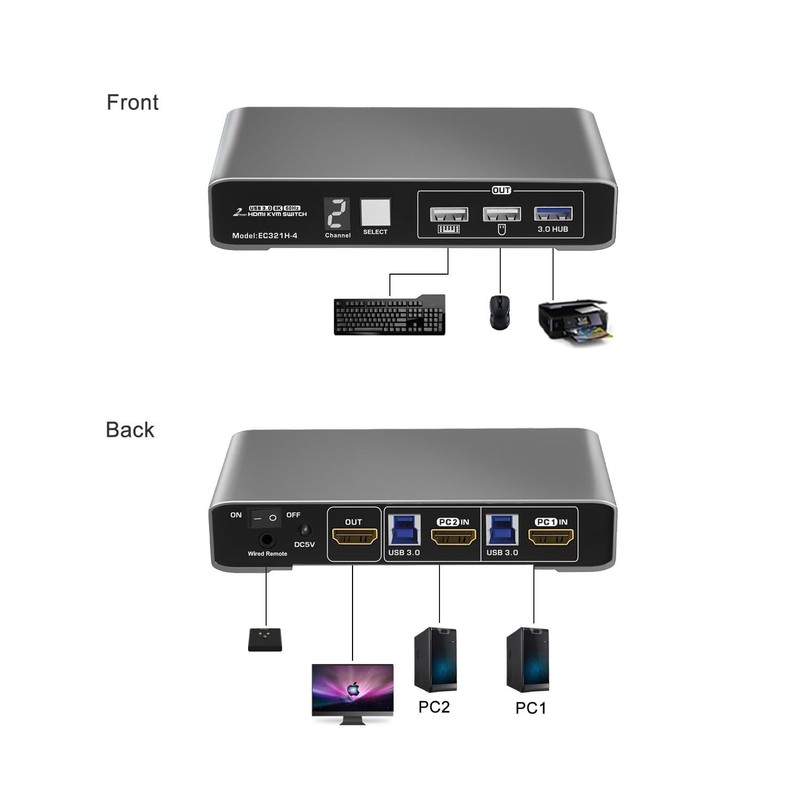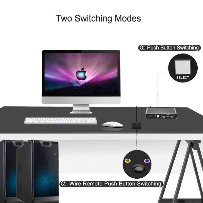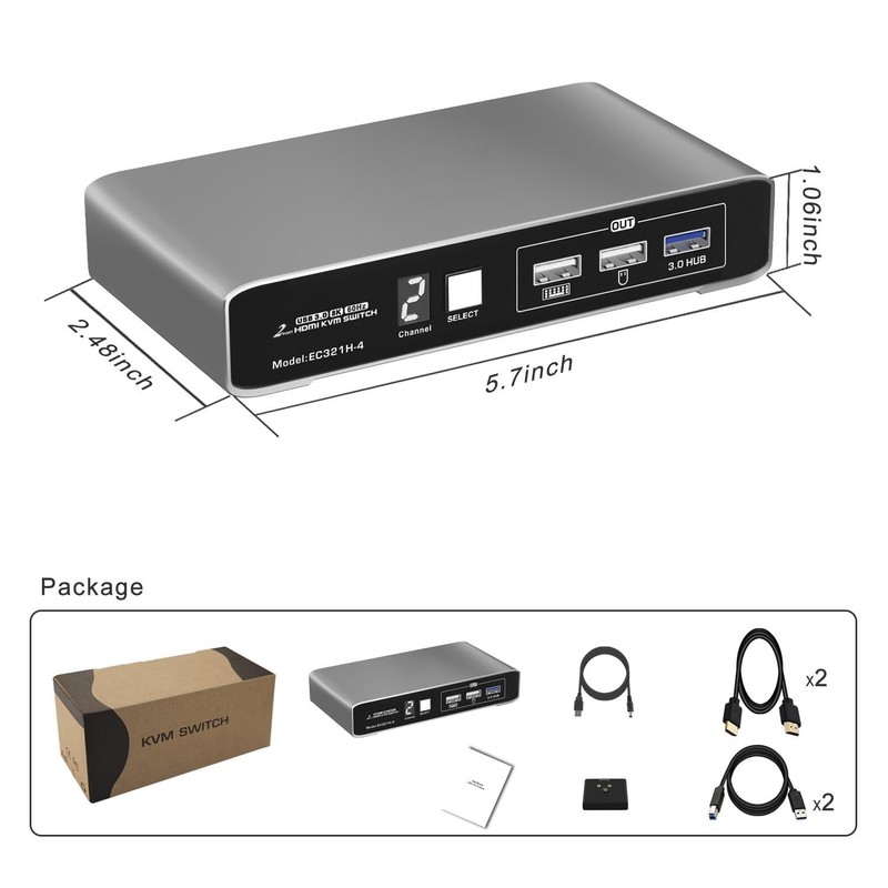 - HDMI KVM Switch 2 Port - The 2-Port HDMI KVM Switch enables two HDMI-equipped PCs to share 1 monitor, a keyboard, and mouse, facilitating effortless switching between systems. It helps declutter your workspace and maintain a neat, organized environment.
