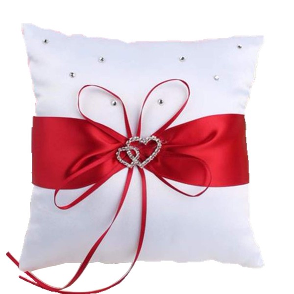 he andi 7.8" Satin Double Hearts Decoration Wedding Ring Bearer Pillow (Red)