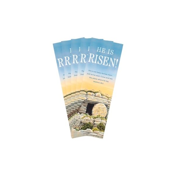 Spread the Good News of Easter to your community with these He Is Risen Easter Church Bookmarks inspired by Matthew 28:6. These bookmarks feature an illustration of the empty tomb at sunrise, and in the sky are words from Matthew 28:6 that read: He Is Risen! He is not here; he has risen, just as he said. Come and see the place where he lay. Matthew 28:6 Each package comes with 25 bookmarks for you to hand out at church for the Easter season.
