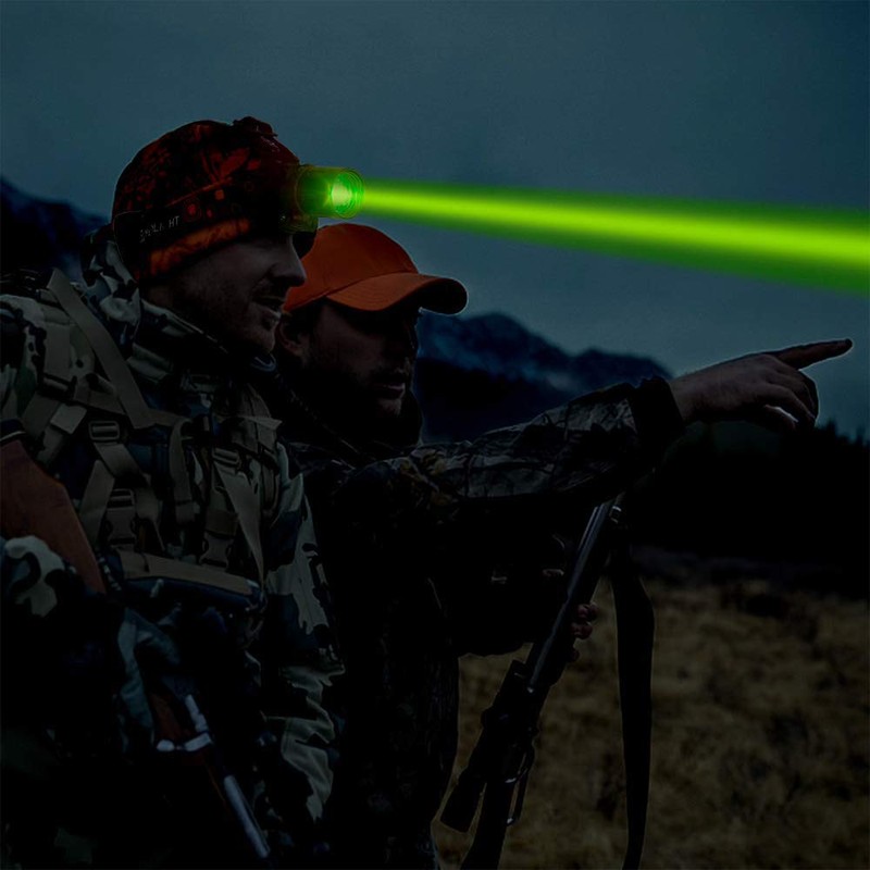 - Zooming out the head torch green LED to be used as a spot light, which can reach out as far as 250 Yards. Zooming in as a flood light provides a wide view when you are searching targets. Free your hands, perfect green lights headlamp for night hunting.