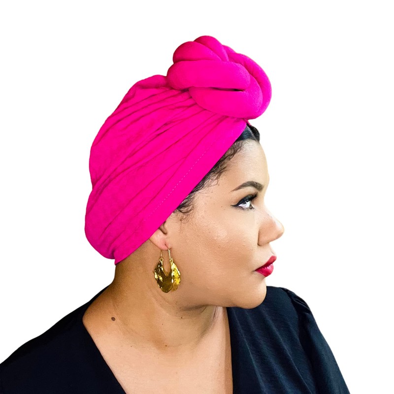 PRE-TIED TURBAN HEADWRAP. Perfect for those that struggle to tie or knot headwraps or if you're short of time. The fabric is a soft, stretch textured polyester. Make a statement with the large twisted knot detail. Super quick and easy to style- just wear like a cap and you're ready to go! Care instructions: Wash on delicate (or hand wash), and hang to dry. Do not tumble dry. ***ONE SIZE FITS ALL***