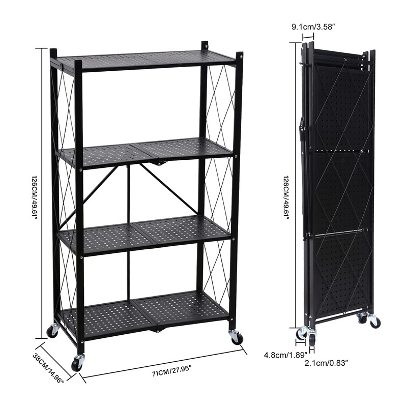 - The foldable storage shelves features 4 professional grade caster wheels for easy mobility .